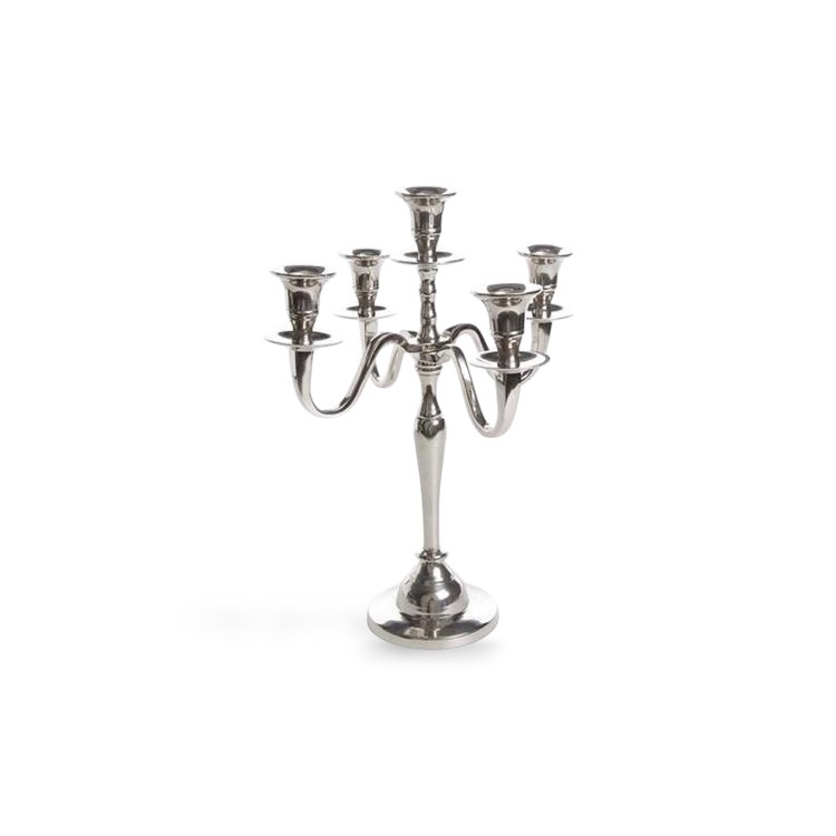 Verzilverde 5-kaars kandelaar huren voor een sfeervolle en elegante tafelsetting?