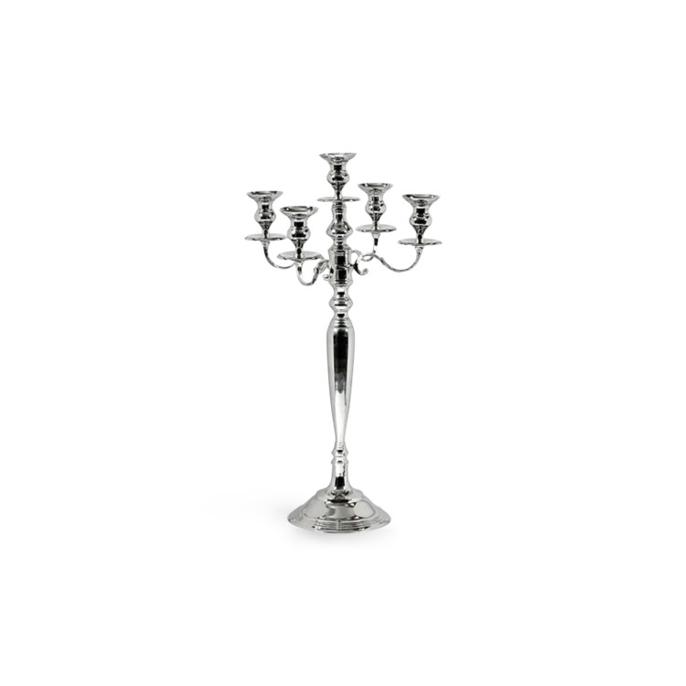 Deze verzilverde kandelaar van 42 cm hoog met vijf armen is dé blikvanger voor stijlvolle diners, bruiloften, gala’s of ceremoniële settings. Perfect als centerpiece op ronde tafels of als decoratief element op een zuil, bij entree of altaar.