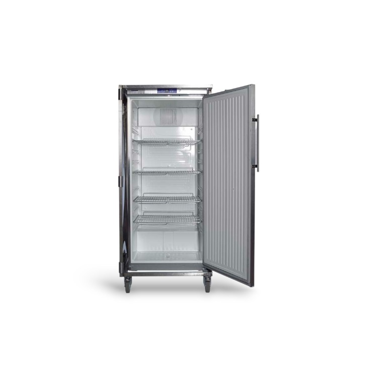 Professionele RVS koelkast van 570 liter huren met geforceerde koeling. Ideaal voor evenementen, foodtrucks of tijdelijke horecakeukens.