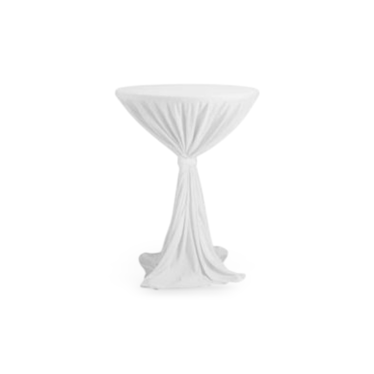 Deze witte statafelhoes combineert prachtig met zachte tinten, gouden decoratie of pastelkleurige bloemstyling en vormt een perfecte basis voor chique eventstyling.
