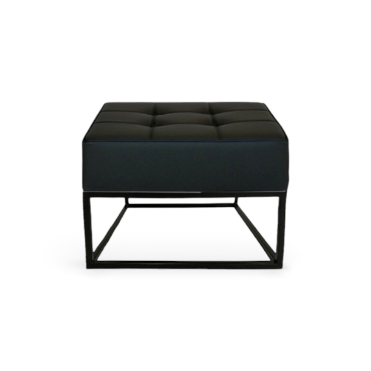 Zwart lederen gecapitonneerde lounge poef op stalen onderstel.