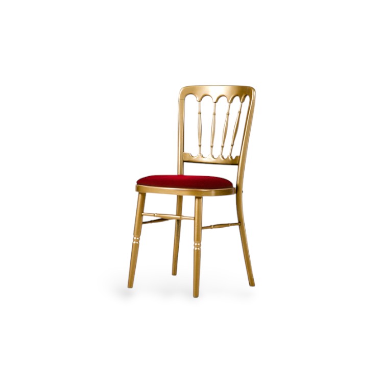 De Gouden Franse Stoel met rode zitting straalt warmte, luxe en klasse uit. Perfect voor elegante diners en stijlvolle events.