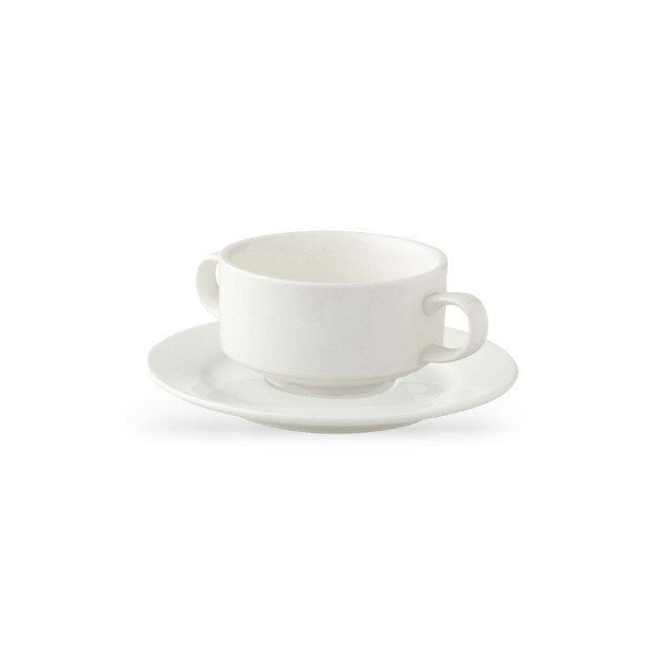 Deze stijlvolle witte soepkom met schotel uit de Palmer-servieslijn is ideaal voor het serveren van soep, bouillon of kleine voorgerechten. De strakke vormgeving en neutrale uitstraling passen bij elk type evenement.